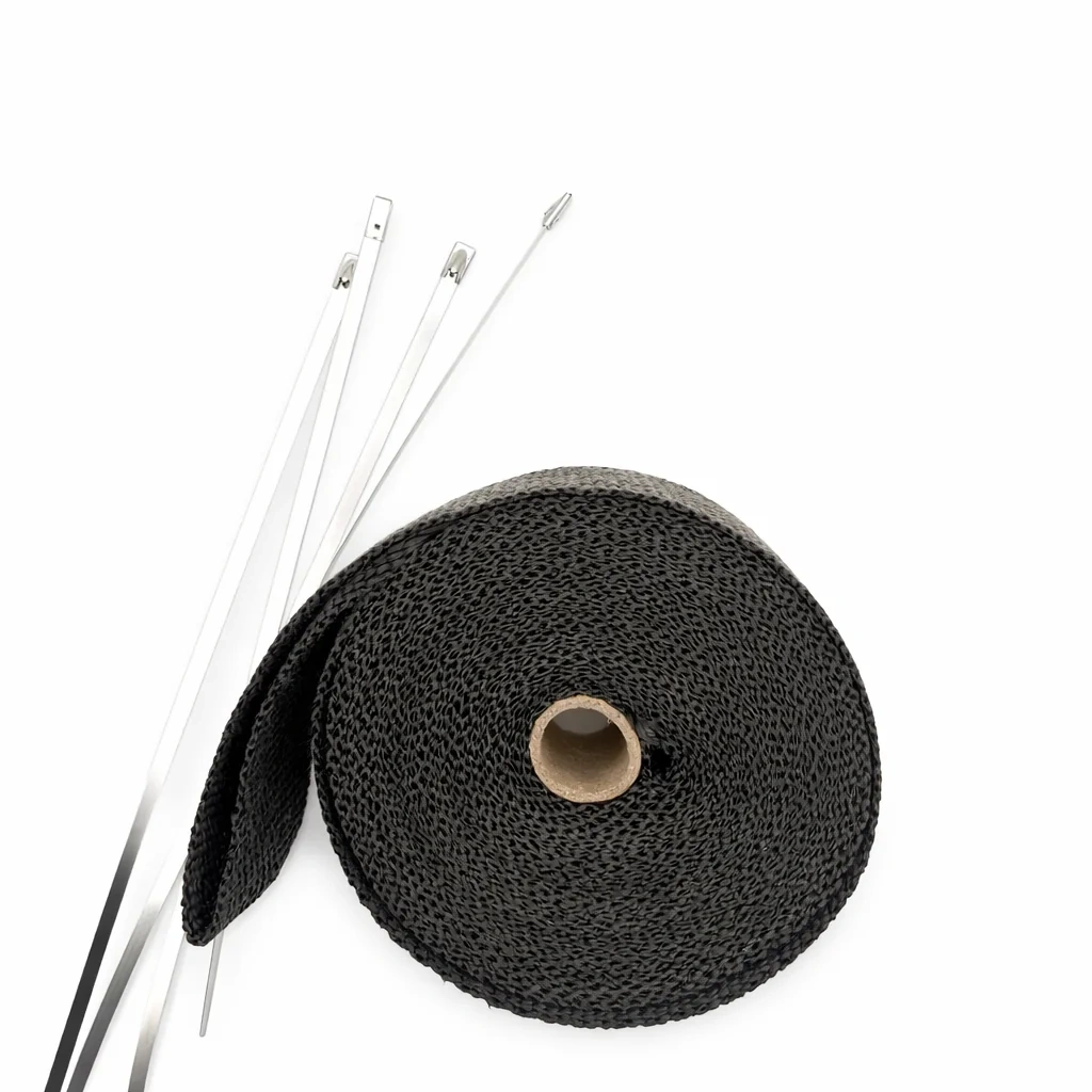 Termoizolacyjna taśma wykonana z włókna szklanego do owijania elementów układu wydechowego oraz gorących części układu turbodoładowania w zastosowaniach motoryzacyjnych i motorsportowych.