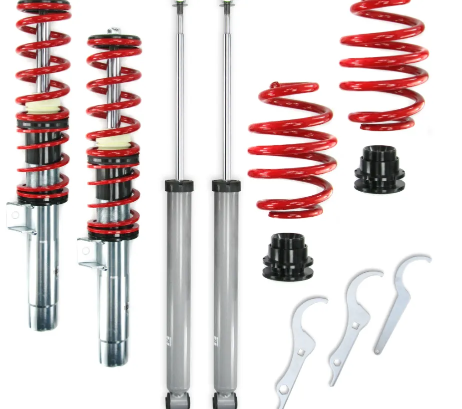 Zestaw umożliwia płynną regulację wysokości zawieszenia zarówno na osi przedniej, jak i tylnej, co pozwala na indywidualne dostosowanie parametrów jezdnych oraz nadanie pojazdowi sportowego wyglądu.